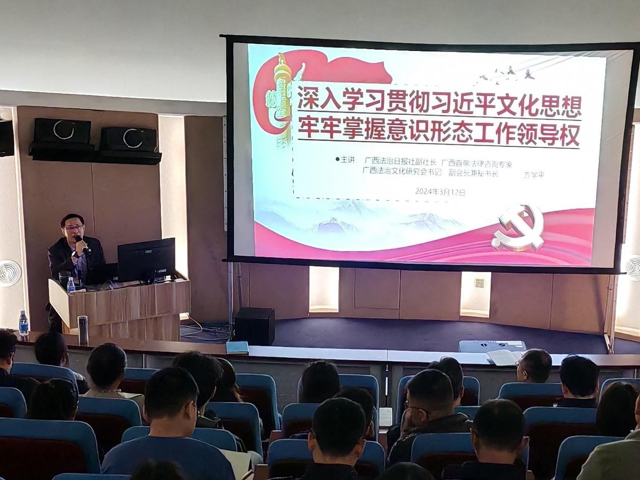 为了深入学习贯彻习近平新时代中国特色社会主义思想和党的二十大精神,进一步增强教职工意识形态风险识别能力和抵御风险能力、推动意识形态工作责任制落到实处,3月12日, 学院党委邀请了广西法治日报社副社长、广西首席法律咨询专家、广西法治文化研究会书记、副会长兼秘书长方学平做了题为《深入学习贯彻习近平文化思想牢牢掌握意识形态工作领导权》的专题报告。报告会由学院党委书记袁涛同志主持,全体教职工及各学生支部书记、委员参加了报告会。