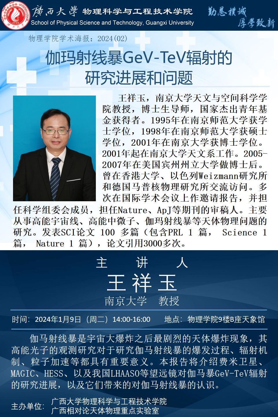 下一篇:2024年学术报告系列之01:海外名师大讲堂——Looking forward to the future of gamma-ray astronomy