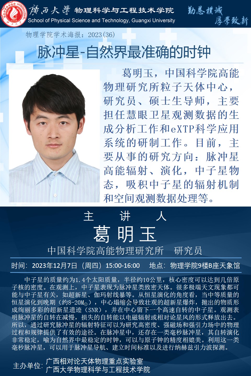 上一篇:2023年学术报告系列之37:“宇宙时钟”(脉冲星)在导航与守时中的应用
