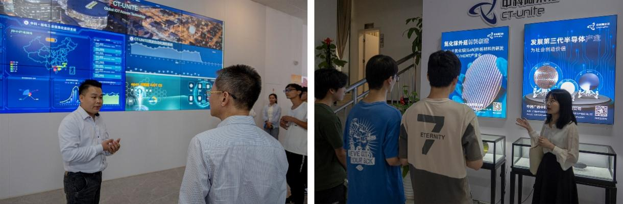 接着,参观了新一代高科技物联网芯片核心平台—广西中科阿尔法。向我们展示了公司的互联网技术成果、集成电路设计、人工智能行业应用系统及产品生产线。除此之外,其展示了未来的发展目标—第三代半导体产业,侯汧妤老师为学生们解释了氮化镓等半导体材料相关专业知识。无论是数据的获取和存储,还是计算能力的体现都离不开硬件载体—芯片,半导体的发展是现代社会高速发展的重要支撑,我们国家拥有最大的终端市场,拥有雄厚的制造实力。