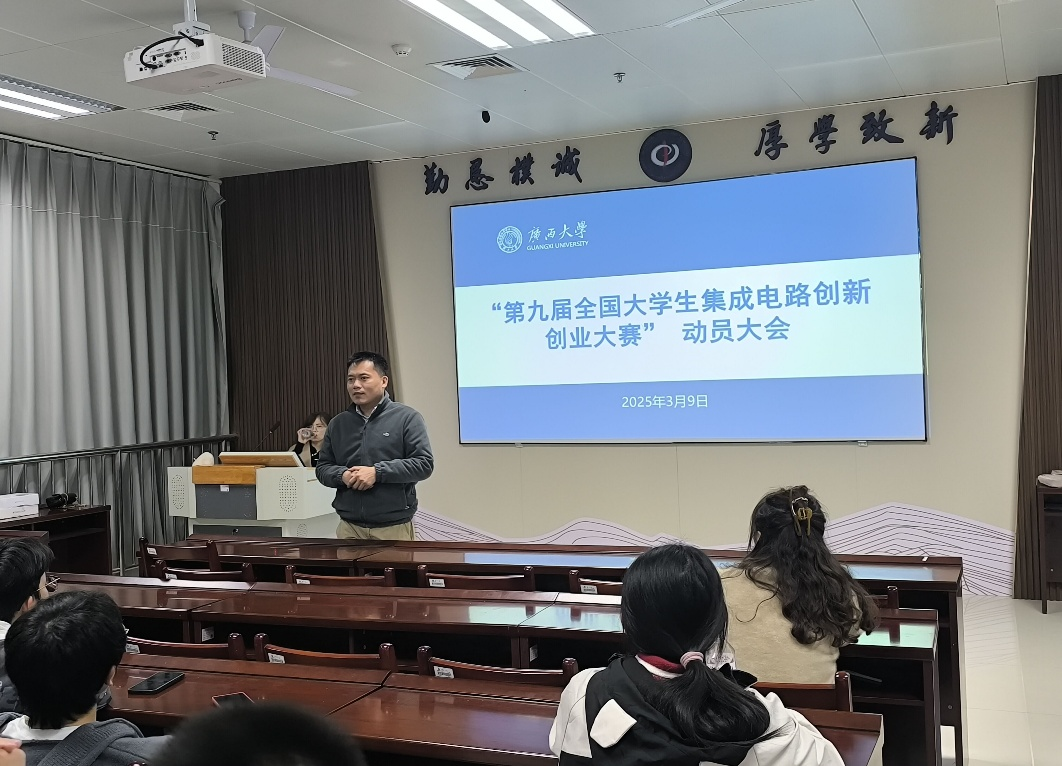 在A506教室召开第九届全国大学生集成电路创新创业大赛动员大会,主持学院行政日常工作副院长刘宏邦、团委副书记龙思宇等老师参加会议,实验教学中心副主任刘瑶主持会议。