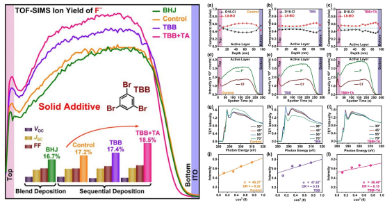 薄膜光伏团队与韩国浦项科技大学Kilwon Cho教授等人利用具有高挥发性和低成本的1, 3, 5-三溴苯(TBB)作为受体溶液中的固体添加剂,并采用顺序沉积方法制备有机太阳能电池(Organic Solar Cells,简称OSCs)的光活性层,再结合热退火(TA)来调节由D18-Cl/L8-BO组成的OSCs光活性层中的垂直相分布。研究通过加入添加剂TBB,再结合热处理,在薄膜中形成长距离的分子填充和均匀的“双连续给体-受体”网络,从而提高薄膜的结晶度和在垂直方向上有利的供体-受体分布。研究中"TBB+TA"处理过的OSCs实现了18.5%(平均18.1%)的光电转换效率,VOC为910 mV,JSC为26.3 mA cm-2,FF为77.2%,优于其控制器件(17.2%,平均16.7%的光电转换效率)。器件性能的提高与激子生成速率、电荷载流子迁移率、电荷载流子寿命的增加以及双分子电荷重组的减少有关。该工作将先进的器件性能归因于垂直方向上梯度分布的给体-受体浓度,为优化顺序沉积的顶层形态以实现高性能有机太阳能电池提供了思路。