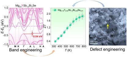 该工作优化了Mg3(Sb,Bi)2基热电材料的制备工艺,研究了Y,Se元素掺杂对材料的能带以及微观结构影响。文中通过计算发现Se,Y元素在Mg3(Sb, Bi)2基材料的掺杂能够有效的优化材料的能带结构,利于材料的电输运特性。在实验中发现Se,Y原子在分别在Mg3(Sb, Bi)2基材料基的阴阳离子位进行掺杂极大地优化了材料内部中的载流子浓度,材料的电学性能得到了极大的提升。在材料内部中由于Se,Y与Mg,Sb和Bi原子尺寸差异,此时的替代掺杂容易引起Mg3(Sb,Bi)2晶格的畸变以及材料内部微观变化。同时杂质元素Se,Y原子在材料内部产生的缺陷作为散射中心对声子造成强烈的散射,材料的热学性能得到了极大优化。最后材料的最高热电优值ZT达到了1.87,平均热电优值ZT达到了1.2。在温差为450K时,材料热电转换效率通过计算能达到13.8%高于目前的商用的Bi2Te3基材料。本工作通过载流子及缺陷工程优化了Mg3(Sb,Bi)2基热电材料,阐明材料在中温区间的优异性能以及未来极高的潜在应用性。