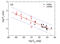 博士生邹乐等人在不同途径形成磁性质方面有新的发现,相关研究小组利用Swift卫星探测到伽玛射线暴数据研究大质量恒星坍缩及双致密星并合产生的磁星的性质,发现通过致密天体并合形成的新生磁星典型制动指数是3,而在大质量恒星塌缩形成的磁星的典型制动指数n~4,表明两类新生磁星的自转变慢分别主要由磁偶极辐射主导、引力波和磁偶极共同主导。前者途径形成的磁星表面磁场比后者的高一个数量级,而自转周期则比后者大一个数量级,但两者均遵循相同的自转周期与喷流辐射能量之间的关系,一个旋转速度更快的磁星能产生能量更高的喷流,这与它的形成方式无关。与超亮超新星(SLSNe)中的磁星和稳定脉冲星的性质进行比较,超亮超新星中的磁星表面磁场与大质量恒星坍缩形成的磁星还要低一个数量级,但是其自转周期基本一致,而致密天体并合形成磁星的制动指数与年老磁星比较吻合,自旋变慢均主要由磁偶极辐射占主导。
