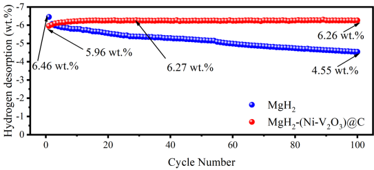 添加功能碳材料是改善镁基材料储氢性能的有效手段,但如何充分发挥功能碳材料中各组元最大作用值得研究。本研究通过大孔阳离子交换树脂为前驱体,通过离子交换和热还原法成功合成了(Ni-V2O3)@C复合材料,提出了C、Ni和V2O3协同催化作用机制。将Ni和V2O3负载在C基体上,能充分发挥Ni和V2O3的催化特性,而C则可以抑制材料的团聚。因此,在C、Ni和V2O3协同催化作用下,MgH2-(Ni-V2O3)@C复合材料在室温下即可吸收氢气,且经过100次吸放氢循环后容量保持率仍为99.8%。该工作对实现镁基材料低温氢化和循环稳定性的提升具有重要意义。