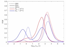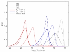 图1:不同磁场与状态方程下NS-NS并合后产生的SMNS的坍缩时间(左)与能量输出分布(右)的概率密度分布