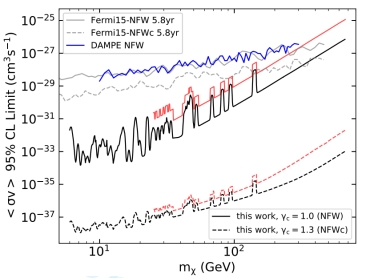 伽马射线线谱被认为是暗物质粒子湮灭的有力证据。银河系中心黑洞的绝热膨胀会增强周围暗物质密度,形成尖峰型的暗物质轮廓,从而增强暗物质湮灭信号。该工作利用悟空号暗物质探测卫星(DAMPE)的观测数据并未找到置信水平可接受的任何谱线信号,进而限制尖峰轮廓下暗物质粒子的湮灭截面,给出的限制比在NFW暗物质轮廓强。