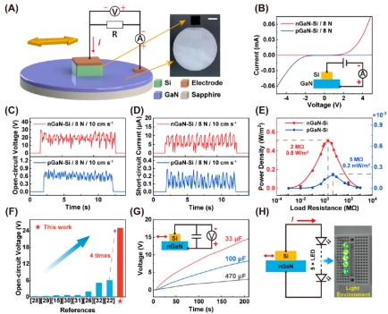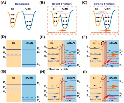 如图所示,基于电子云电位阱模型和能带图对载流子激发和输运机制的可能解释如下:氮化镓和Si的异质结具有不同的表面态图(A)和费米能级(图D、G)。在摩擦过程中,由于不同的摩擦电顺序,Si倾向于失去电子,而氮化镓倾向于获得电子。这是氮化镓和Si的摩擦电气化过程。连续的摩擦可以在接触界面上形成一个定向的界面电场,这可能是由于氮化镓的表面状态(缺陷、位错)能够存储电子,如图B所示。电场的方向是从Si到氮化镓。当摩擦发生较强时,表面状态的电子变得更活跃,更容易在Si和氮化镓之间转移,从而形成更大的界面电场如图C所示。较大的界面电场使得SDC-TENG具有较高的输出电压。通过能带图可知,当Si与nGaN接触时,在界面处形成了一个内置的电场。同时,也形成了界面电场,其方向与内置电场相反。由于界面电场的强度大于内置电场,由摩擦激发的电子−空穴对被界面电场分隔形成电流,如图E所示。当摩擦增大时,界面电场变大,激发的电子−空穴对更多,导致SDC-TENG的电压和电流增加,如图F所示。当Si与pGaN接触时,内置电场的方向与界面电场的方向一致,驱动电子−空穴对结合在一起,如图H所示。当摩擦越严重时,界面电场变大,激发态载流子增加(图I),SDC-TENG的电输出增加。