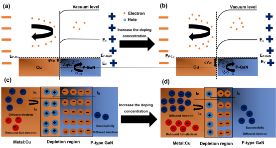 GaN中载流子浓度的增加对输出电流有以下影响:(1)当载流子浓度增加时,流向界面的电子数增加,电子被界面反弹的概率增加,随着载流子浓度的增加,热电子的数量增加(2)耗尽区变薄(如下图),这导致内置电场增加,并加速热电子的流动(3)随着GaN中载流子浓度的增加,缺陷密度也增加,样品的表面粗糙度增加,GaN的表面结构受到更大程度的破坏,界面处有更多的断裂的结合见键,这增加了电子在界面处的反弹概率。