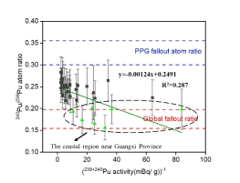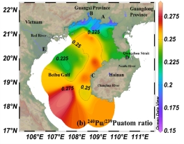 团队分析了北部湾表层沉积物中的钚同位素,研究了北部湾钚同位素的空间分布和来源。表层沉积物中的239+240Pu活度为0.012-0.451 mBq/g(平均值:0.171 ± 0.138 mBq/ g,n = 36),在南湾口呈现出逆时针方向下降趋势,趋势与北部湾的洋流相似。表层沉积物中240Pu/239Pu原子比为0.156-0.283(平均值:0.236±0.031,n=36),略高于全球沉降值0.18。这表明北部湾的钚来源受到了太平洋试验场(PPG)的影响,利用双端元模型计算出,PPG衍生的Pu的平均贡献估计为52%±24%。该研究首次揭示了PPG衍生的Pu的运输路径,在北部湾沿岸核电厂快速发展的背景下,为未来核电厂运行环境风险评估提供了基础数据。