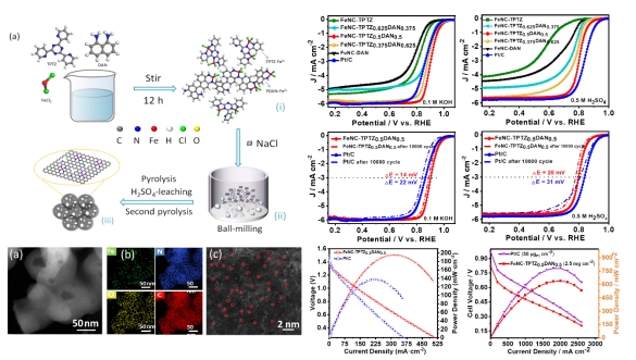 本研究报道了一种通过同步络合-聚合法在熔融NaCl辅助热解下合成过渡金属-氮-碳(M-N-C)催化剂的通用策略。其中以2,4,6-三(二-吡啶基)1,3,5-三嗪(TPTZ)为过渡金属铁的配体,二氨基芳香族化合物1,8-二氨基萘(DAN)为单体,通过共聚反应,成功制备了高活性的Fe-N-C催化剂。研究表明不同摩尔比的TPTZ与DAN对最终催化剂的活性位点和衍生的碳结构构型具有显著的影响,表现出不同氧还原性能。其中,摩尔比为1:1的FeNC-TPTZ0.5DAN0.5催化剂在碱性和酸性溶液中表现出优异的氧还原性能,其半波电位分别达到了0.9 V和0.8 V。同时,使用该催化剂的锌空气电池的最大功率密度可达192 mW cm-2,质子交换膜燃料电池最高输出功率为640 mW cm-2,进一步表明了该方法制备的Fe-N-C催化剂的高性能。由于过渡金属配体、金属离子和聚合物单体种类繁多,与其他报道的方法相比,该方法为合成高性能的M-N-C催化剂提供了一个更广阔的平台。