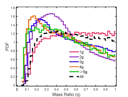 图二 不同代并合的双星质量比分布