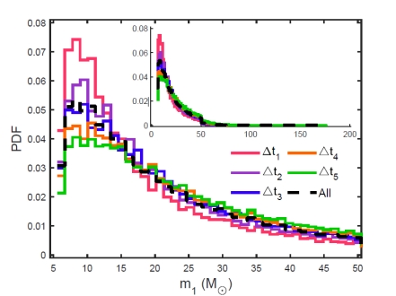 图一 AGN不同时期发生的并合的(大质量)黑洞分布