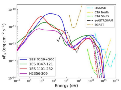 部分活动星系核在TeV能区呈现一个显著的超出轻子模型预期的辐射成分。这个成分的物理起源一直是争议中。研究小组研究了四个具有显著TeV超出的极端BL Lac天体,发现单区轻-强子辐射模型能很好解释其宽波段能谱。在这个模型中,从射电波段到GeV伽玛射线波段的辐射主要来自于电子(正电子)的同步辐射和逆康普顿散射,而TeV超出则主要来源于质子-光子相互作用。模型预言由级联过程产生的轻子辐射在keV-MeV波段有显著的贡献,在宽波段能谱中表现为平台或是峰状凸起。TeV超出与keV-MeV超出的联合观测有望给出强子辐射的关键证据。