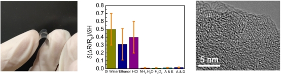 纳米能源研究中心邓承浩课题组硕士生赵斯麒等人制备了基于单根碳纳米线圈的柔性湿度传感器件,针对其响应机理、湿度响应调控,以实现独立的温湿度微纳传感器件为目标,开展了系统研究。研究发现,由于独特的弹簧结构,单根碳纳米线圈在较大的应变范围内可以保持其温湿度响应不变。通过氨水处理的单根碳纳米线圈,其湿度响应受到了极大的抑制,在20%至90%的湿度范围内,其电阻几乎保持不变,但其温度响应并未受到明显影响。经过X射线光电子能谱、红外光谱和能量色散谱分析及电导率统计发现,氨水处理在碳纳米线圈中引入了非挥发的饱和水分子,这些水分子经由多晶-非晶混合结构中存在大量的空位渗入碳纳米线圈。