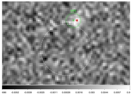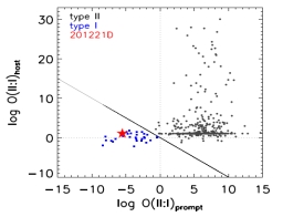 图1 左图:GRB 201221D的XRT、光学余辉和寄主星系的位置。右图:通过朴素贝叶斯方法得到的GRB 201221D可能的物理起源,type I和type II分别表示致密星和大质量恒星起源。