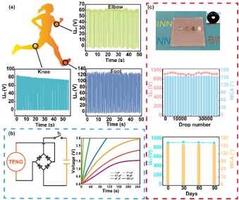 该工作设计了一种高介电性及表面多层次结构的PDMS基TENGs,实现了TENGs的高功率输出与人体运动能的有效收集。研究通过将中空分级的二氧化硅(H-SiO2)、全氟聚醚(PF)和PDMS预聚体的增材复合制备了一种复合薄膜(PFS),其在保持柔韧性不变的情况下介电性相比于纯PDMS膜提高了3.5倍,进一步以这种高介电性的PFS膜为载体,通过表面刻蚀加工技术在PFS膜表面形成了10-30 nm的凸起,这种10-30 nm, 60-80 nm, 300-500 nm的多层次表面结构可以实现固体表面最大的接触面积及保证薄膜表面优异的超疏水性。TENGs的电学输出结果显示,最大开路电压为910 V,短路电流为24 μA,功率密度为0.25 mW/cm2,同时薄膜表面在经过40000滴水撞击及90天后仍然保持了良好的超疏水性。该工作实现了TENGs的高功率输出及优异的超疏水性,在防水的自供电可穿戴领域具有广泛的应用前景。