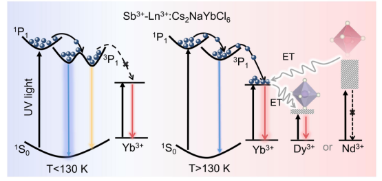 该研究通过构建镧系离子(Ln3+:Nd3+或Dy3+)与Sb3+共掺杂Cs2NaYbCl6双钙钛矿能量转移模型,来揭示温度和稀土能级水平对能量转移和发光的影响。研究发现,Sb3+-Ln3+掺杂Cs2NaYbCl6双钙钛矿在不同温度下的不同激发态结构和稀土能级的相对位置下协同决定了光物理过程。此外,Sb3+-Nd3+(或Dy3+)离子共掺Cs2NaYbCl6双钙钛矿在980 nm激发下分别表现出黄色和红色的上转换(UC)发射。基于Sb3+-Ln3+掺杂Cs2NaYbCl6多模发射、对温度的敏感性和高效近红外发射的优势进行了防伪、温度传感以及近红外成像等多功能应用。