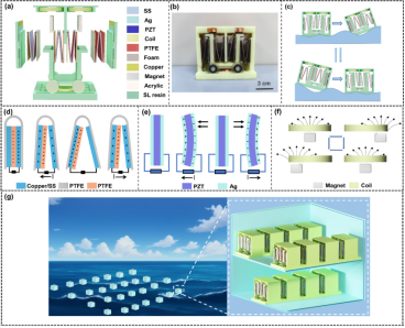a-c) MSHG结构设计,d) TENG单元、e) PENG 单元和 f) EMG 单元的工作原理,g) MSHG网络示意图。