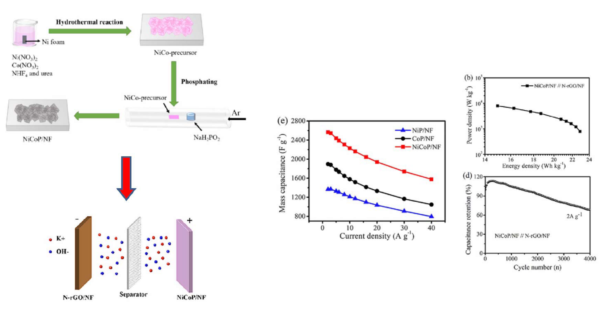 通过水热法和磷化法在泡沫镍上合成了NiCoP纳米阵列。作为超级电容器的电极材料,NiCoP/NF纳米阵列表现出优异的性能,以NiCoP/NF纳米阵列作为阳极、氮掺杂还原氧化石墨烯作为阴极的混合型超级电容器的比能量高达22.8 Wh kg-1,4000次循环后电容保持率为初始比电容的68.33%,具有良好的循环稳定性。NiCoP/NF纳米阵列电化学性能的改善主要源于三维异质结构、镍和钴金属元素的正协同结合以及磷化物的高导电性。研究结果为NiCoP/NF电极在超级电容器储能中的应用提供了潜在解决方案。