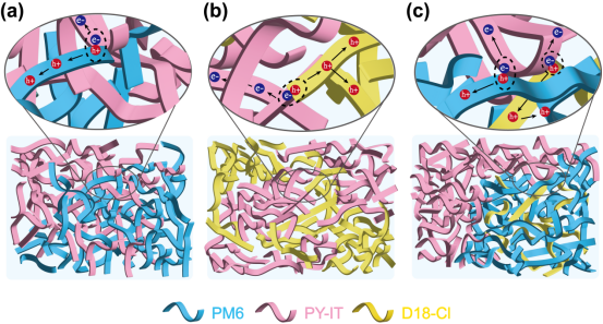 最后,本工作提出了PM6:PY-IT、D18-Cl:PY-IT和PM6:D18-Cl: PY-IT的全聚合物层示意图,从微观层次上解释了形态的变化。PM6和PY-IT具有良好的混溶性,有很大程度的给体-受体界面。虽然激子解离效率提高,但双分子电荷重组也增加。相反,D18-Cl和PY-IT的表面能差异显著,导致D18-Cl和PY-IT的聚集相分离,不利于D18-Cl和PY-IT网络的激子有效解离。因为D18-Cl与PM6具有良好的相容性,而且与PY-IT的表面能有显著差异。因此,D18-Cl可以与PM6精细地混合,将PY-IT推出混合给体相,从而减少PM6和PY-IT界面。此外,当PY-IT被光激发时,D18-Cl提供了另一种激子解离途径,从而改善了受体吸收范围内的光子到电子的转换。我们的工作肯定了三元策略对提高All-PSCs光伏性能的重要性,为从两个兼容的聚合物给体出发,制造高效的三元全聚合物有机太阳能电池提供了新的见解。