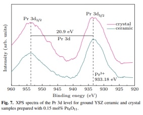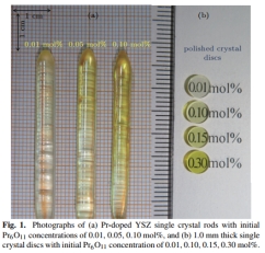 该项工作通过光学浮区法生长了高熔点Pr6O11掺杂的YSZ单晶体,并经过一系列结构和光学性能测试手段,研究了Pr离子在YSZ基质中的价态和光谱特性。当Pr6O11浓度为0.15 mol%时,晶体的发光性能最佳,而当Pr6O11浓度较高时,晶体的发光性能出现猝灭现象。此外,Pr掺杂YSZ单晶在橙红色区域的色纯度达到98.9%。