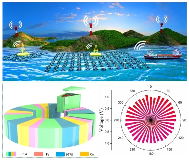蓝色能源团队发展了一种多角度、可拼接且上下对称的方环状的摩擦纳米发电机,实现了多频率响应,且器件在倾覆时仍能保持原有的输出,表现出良好的收集能力。还可以根据器件在阵列中的不同位置,通过调整其方环的组成单元,从而因地制宜地调控器件的波浪响应频率,提高阵列的波能采集效率。用该发电机供能驱动商用射频模块,实现无线信号传输,为发展海洋自驱动传感器提供了可行的策略。研究成果以“O-Ring-Modularized Triboelectric Nanogenerator for Robust Blue Energy Harvesting in All-Sea Areas ”为题在线发表于国际顶级能源类期刊《Nano Energy》上。
