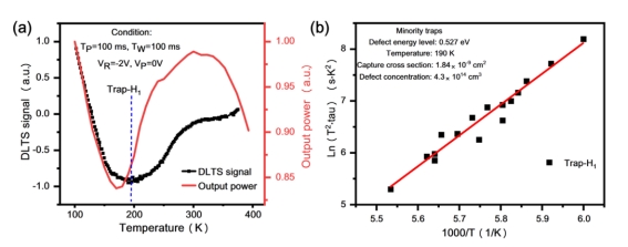 我们发现,在高温(>300 K)下的热降过程中,低正向偏置区的漏电流增加伴随着靠近p侧的量子阱的表观载流子浓度的降低,表明热缺陷的激活增强了陷阱辅助隧穿效应,并导致低电流下的光功率下降更为显著。与常温相比,低温下的低发射功率归因于少数陷阱H1,根据深能级瞬态谱分析(如下图),其在190K下的激活能为0.527 eV。在175 K以上的低温下,由于空穴注入增强,光功率随着温度的升高而增加。通过分析两种热降特性,我们得出结论:热缺陷的激活是255 nm LED高温热降的最可能原因,而与镓空位复合体相关缺陷相关的空穴陷阱H1最有可能是低温热降的来源。
