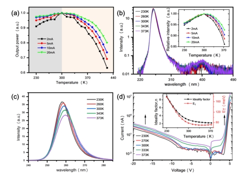 自从新型冠状病毒出现以来,基于AlGaN材料系统的200-280 nm(UV-C)范围内的深紫外发光二极管(DUV LED)已被证明对灭活新型冠状病毒有效。由于体积小、能耗低、开关速度高和预热时间短, AlGaN DUV LED将在许多应用中取代传统的汞灯。然而当这些LED制成的紧凑型照明器时具有明显自加热现象,并需要在85–100℃的温度下工作,而在冷链消毒应用中,它们则需要在零下18℃到零下50 ℃的环境温度下工作。这些温度环境都会导致的LED输出光功率降低,称为热降。在本研究中,我们研究了AlGaN基255 nm LED在温度应力下的两个热降过程的机理,以便在较宽的温度范围内获得稳定的光输出。在我们的温度研究中(如下图),255 nm LED不仅在300 K以上的温度下表现出热降,而且在低温(300 K以下)下光功率也随温度下降。因此,对于这两个温度范围,我们研究了两种不同的热降机制。我们将相关的光功率变化和 I–V特性、C–V提取的表观载流子浓度分布以及一维模拟结果相结合,以研究高低温环境对255 nm LED光功率的影响。最后,通过对深能级瞬态光谱实验的分析,揭示了光功率变化的机理。