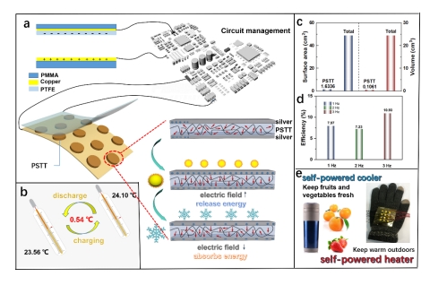 蓝色能源团队将TENG与铁电陶瓷独有的电卡效应相结合,实现了自供电驱动的固态制冷或加热双重温变应用。所设计的自驱动电卡制冷系统在5.5分钟内,在230倍于陶瓷片体积的空间内实现了0.54度的温度变化,电能和热能的转换效率达到10.926%。由于TENGs可以从周围环境收集分布式的高熵能量(如风能、人体动能和水波能等),将其转化为电能提供给固态冷却或加热设备,因此该研究成果可用于开发便携式的小型化自供电制冷或加热器件。