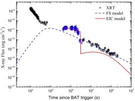 的变化趋势,伴随其中有极强的GeV-TeV辐射(见图2左)。根据此类光变特征,人们可以用于探测伽马暴的甚高能辐射,同时也可据此光变特征来解释伽马暴余辉中所观测到的内平台成分(见图2右)。