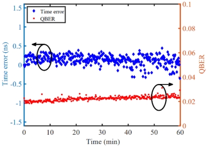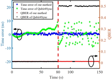 图3 基于量子比特分布式帧同步方法和Qubit4Sync方法的稳定性测试。QBER:量子比特错误率。Time error:时间误差。