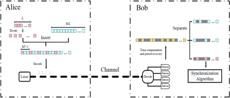 图1 基于量子比特分布式帧同步的QKD示意图。