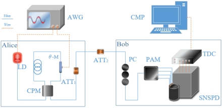 图2 实验装置示意图。AWG:任意波形发生器;LD:商用激光二极管;θ-M:相位调制器;CPM:定制偏振模块;ATT:光衰减器;PC:偏振控制器;SNSPD:超导纳米线单光子探测器;PAM:偏振分析模块;TDC:时间数字转换器;CMP:用于同步算法的计算机。