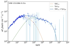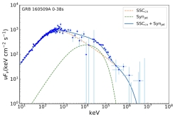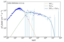 假设呈指数衰减速度分布,如果MJC区域磁场强度为100 G,内边缘速度为0.9c,则MJC区域的剪切流可以将注入的γe=300的电子加速到γe,max=104。这些电子的冷却主要由SSC过程控制,发射通量峰值在keV带。同时,假设喷流核心体洛伦兹因子为300,射流核心的磁场强度为10⁶G,内激波加速电子γe=10⁴—10⁵的同步辐射能量通量在keV−MeV带附近达到峰值。将射流核心和MJC区域的通量相加,总光谱能量分布(SED)显示出与伽马射线暴宽带观测相似的特征。我们提出的模型对GRBs 090926A131108A160509A中观察到的类双峰和Band函数截断式光谱进行了很好地描述。