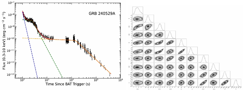 图2. 左图:GRB 240529A的XRT(黑色)光变曲线。右图:GRB 240529A的XRT光变曲线的参数约束。