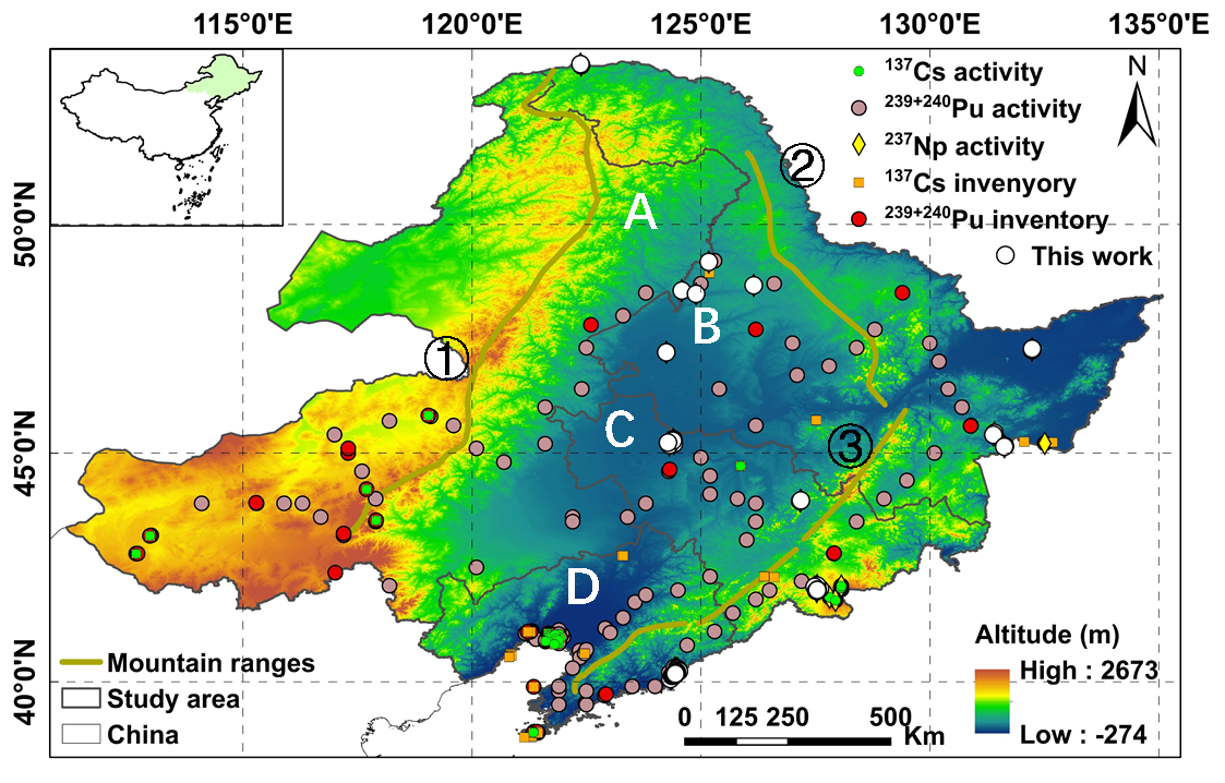 该研究聚焦于铯(137Cs)、钚(²³⁹⁺²⁴⁰Pu)和镎(237Np)在土壤和沉积物中的分布特征,揭示了它们与区域环境因子之间的关联性,为评估核素的环境行为及生态风险提供了科学依据。结果显示,(1)表层土壤中137Cs、239+240Pu和237Np的比活度范围分别为0.9 ~ 55 Bq/kg、0.021 ~ 2.8 Bq/kg和0.02 ~ 3.9 mBq/kg,其累积存量分别为823 ~ 3335 Bq/m²、57 ~ 336 Bq/m²和0.016 ~ 0.31 Bq/m²;(2)¹³⁷Cs和²³⁷Np的表层土壤比活度及其累积存量与土壤全有机质(SOM)、阳离子交换量(CEC)、归一化植被指数(NDVI)和年平均降水量(MAP)呈显著正相关,而与土壤pH值和海拔(ALT)呈负相关;(3)表层土壤中239+240Pu的比活度与SOM、CEC、NDVI和ALT呈正相关,但与pH值和MAP无显著相关性。