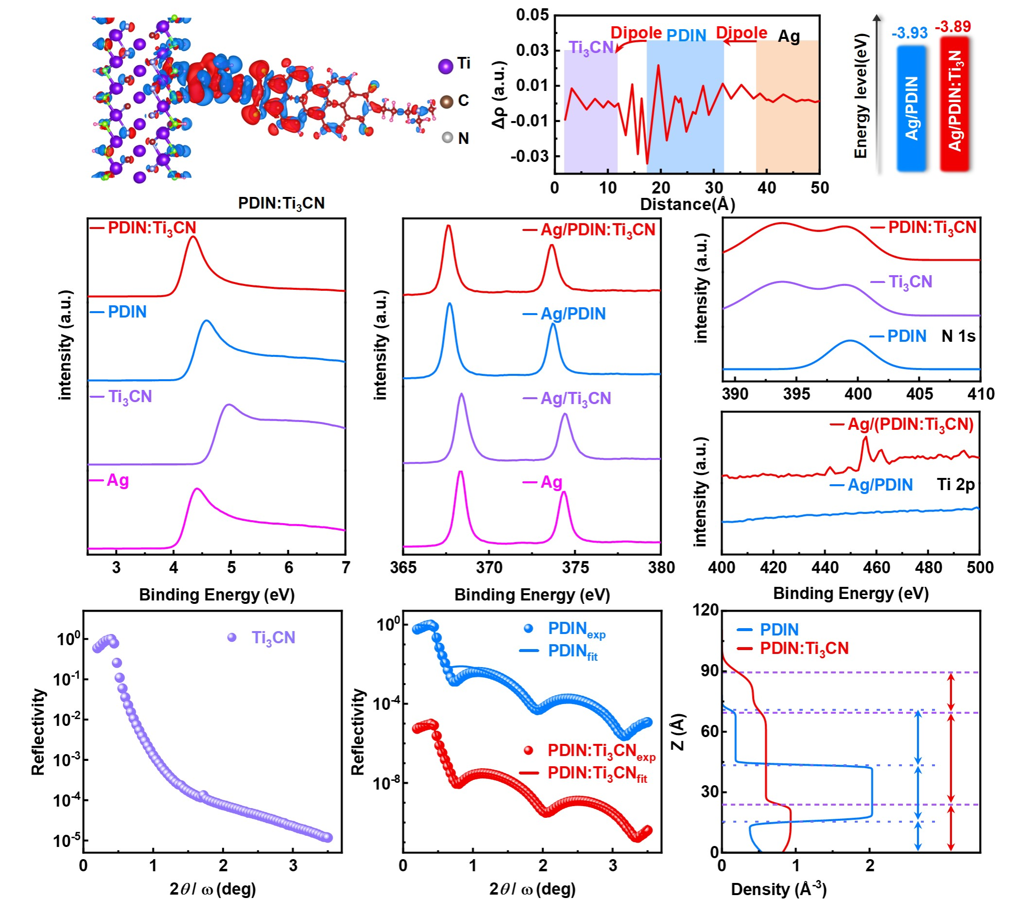 薄膜光伏团队联合四川大学和淮北师范大学采用混合阴极界面层策略(将具有高光学透明度和优异导电性的MXenes二维材料Ti₃CN,修饰PDI及其衍生物)调控PDI分子的聚集行为,揭示Ti₃CN与PDI界面层的N-N耦合作用机制。当在PDIN中引入1 wt%的Ti₃CN时,Ti₃CN表面钛原子通过电子转移与含有氨基的PDIN形成定向偶极结构。N-N相互作用下Ti₃CN:PDIN混合阴极界面层有更合适的能级匹配,增强导电性,从而提升电荷提取性能。此外,Ti₃CN的引入有效调控了PDIN薄膜的垂直相分布,使PDIN更加致密有序,降低陷阱态密度,形成更光滑的表面,从而构建高效的电子传输路径,显著增加了阴极界面层的膜厚耐受性。将该界面层应用于PM6:BTP-eC9和PM6/L8-BO有机太阳能电池器件时,分别实现了20.0%和19.5%的PCE,器件稳定性得到提升。本研究提出的N-N耦合策略为开发高效有机太阳能电池混合阴极界面层提供了新的见解。