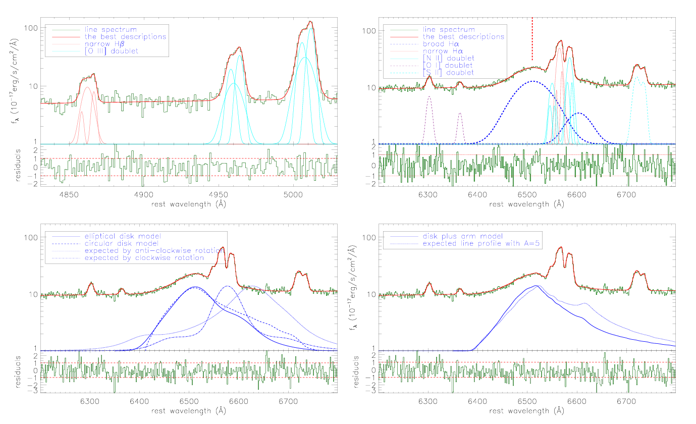 Fig. 1: Top panels show the best fitting results to the emission lines around Hβ and Hα by multiple Gaussian functions. Bottom panels show the best fitting results to the very broad blue-shifted component in the Hα by elliptical accretion disk model, circular accretion disk model and the circular accretion disk plus arms model.