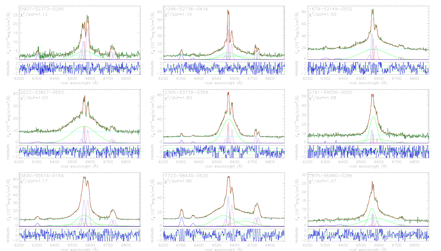 Fig.1: Best determinations of the double-peaked narrow emission lines in examples of SDSS quasars.